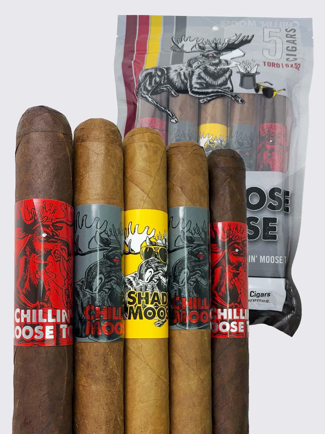 A HANDPICKED VARIETY OF CHILLIN’ MOOSE BLENDS, EACH OFFERING A UNIQUE FLAVOR EXPERIENCE, ALL IN A CONVENIENT TORO SIZE. THIS POUCH IS IDEAL FOR THOSE WHO WANT TO EXPLORE THE BRAND OR ENJOY A MIX OF BOLD YET BALANCED CIGARS.