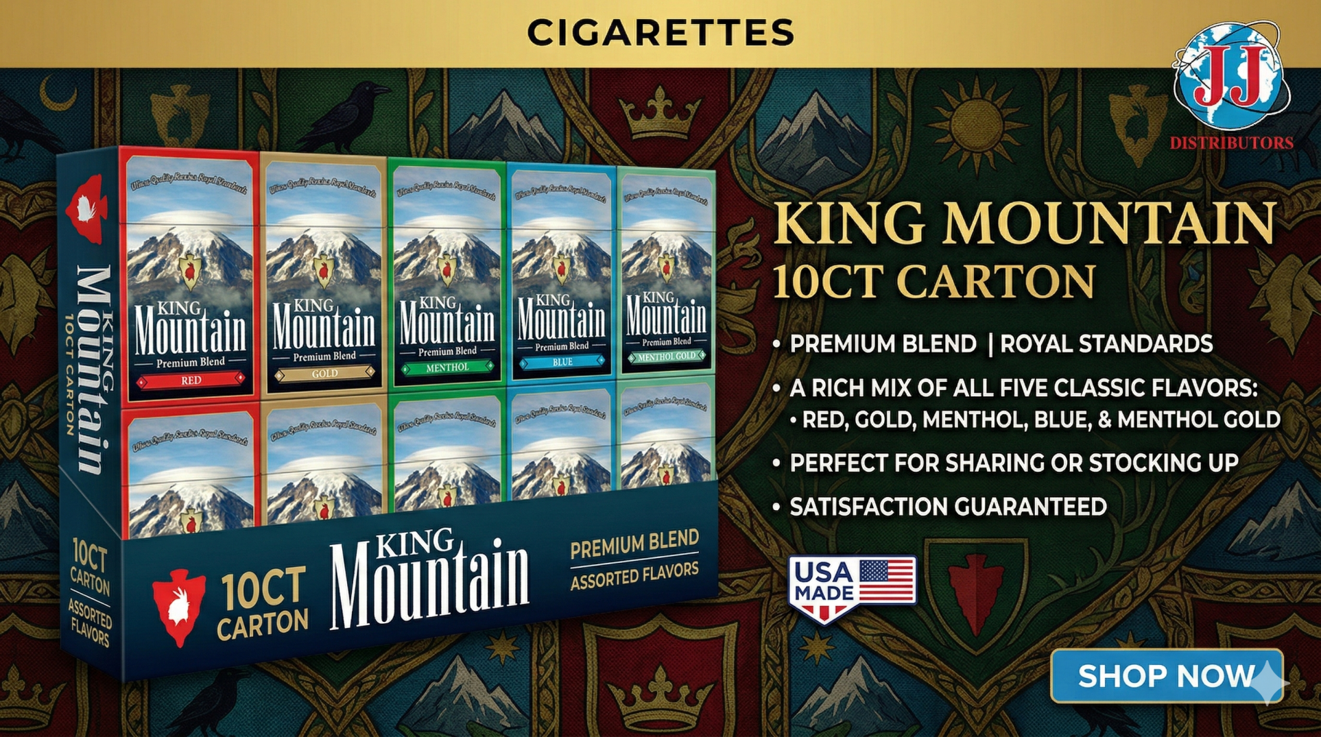 KING MOUNTAIN CIGARETTES ARE PREMIUM TOBACCO PRODUCTS PRODUCED BY KING MOUNTAIN TOBACCO COMPANY INC., A NATIVE AMERICAN-OWNED MANUFACTURER LOCATED WITHIN THE YAKAMA NATION IN WHITE SWAN, WASHINGTON. ESTABLISHED IN THE EARLY 2000S BY DELBERT WHEELER, THE COMPANY AIMS TO OFFER HIGH-QUALITY TOBACCO PRODUCTS AT AFFORDABLE PRICES, BLENDING TRADITIONAL VALUES WITH MODERN MANUFACTURING STANDARDS.