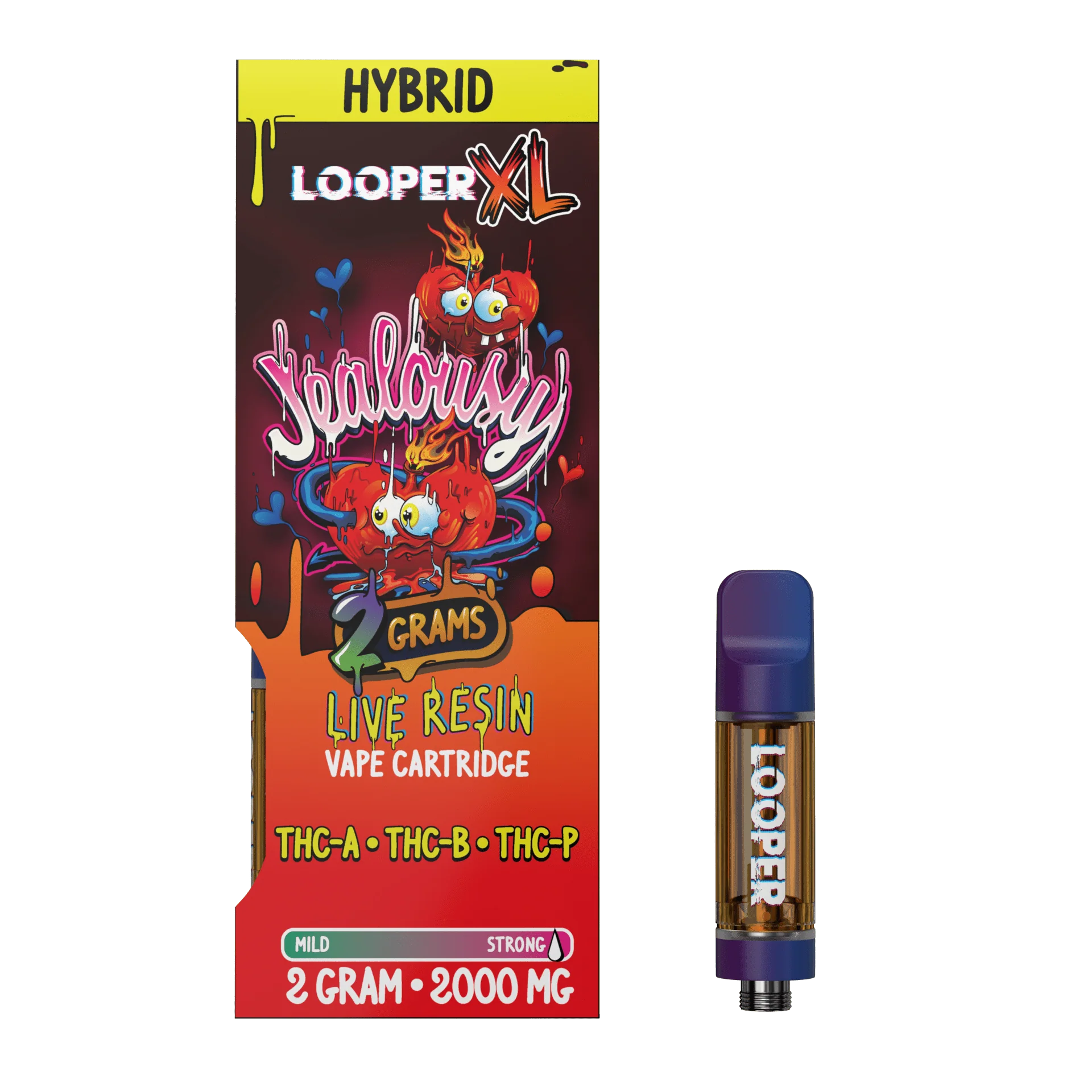 LOOPER CARTRIDGE CONTAINS 2 GRAMS (2000MG) OF LIVE RESIN CONCENTRATE, FEATURING A BLEND OF CANNABINOIDS SUCH AS THC-A, 11-HYDROXY-THC, AND THC-P, ALL DERIVED FROM HEMP.